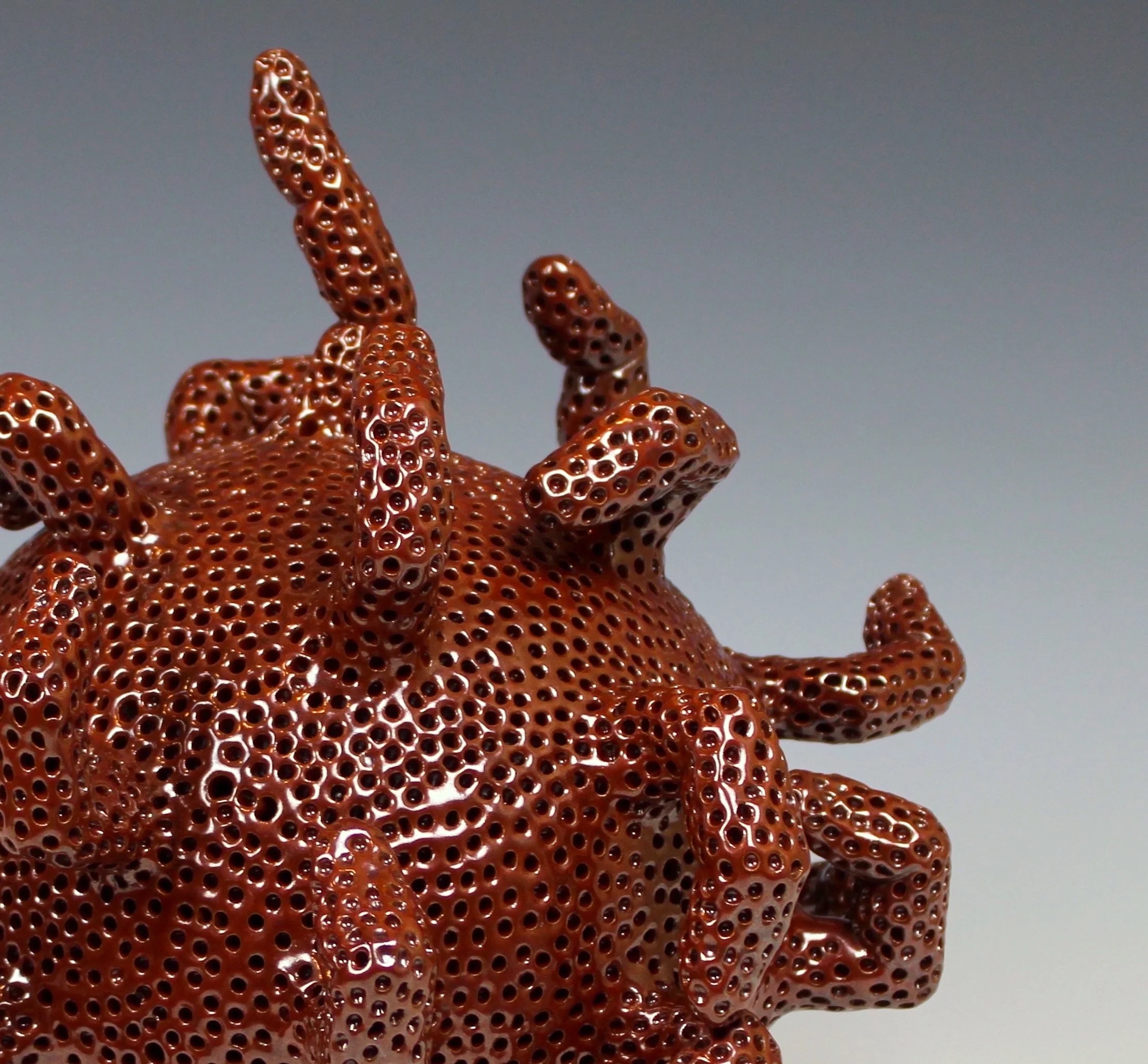 This sculpture commemorates Covid-19 as an unsettling creature that reaches around with fingerlike protrusions. Marrying humor and solemnity, I wanted to capture a composition that implies life, movement, and monstrosity. I glazed the piece red to add to its ominous, dangerous appearance. As for the texture, I wanted to create a surface that confronted the viewer with a sense of uneasiness. This piece stands on 7 fingers, and is made of high fire cone 10 stoneware.